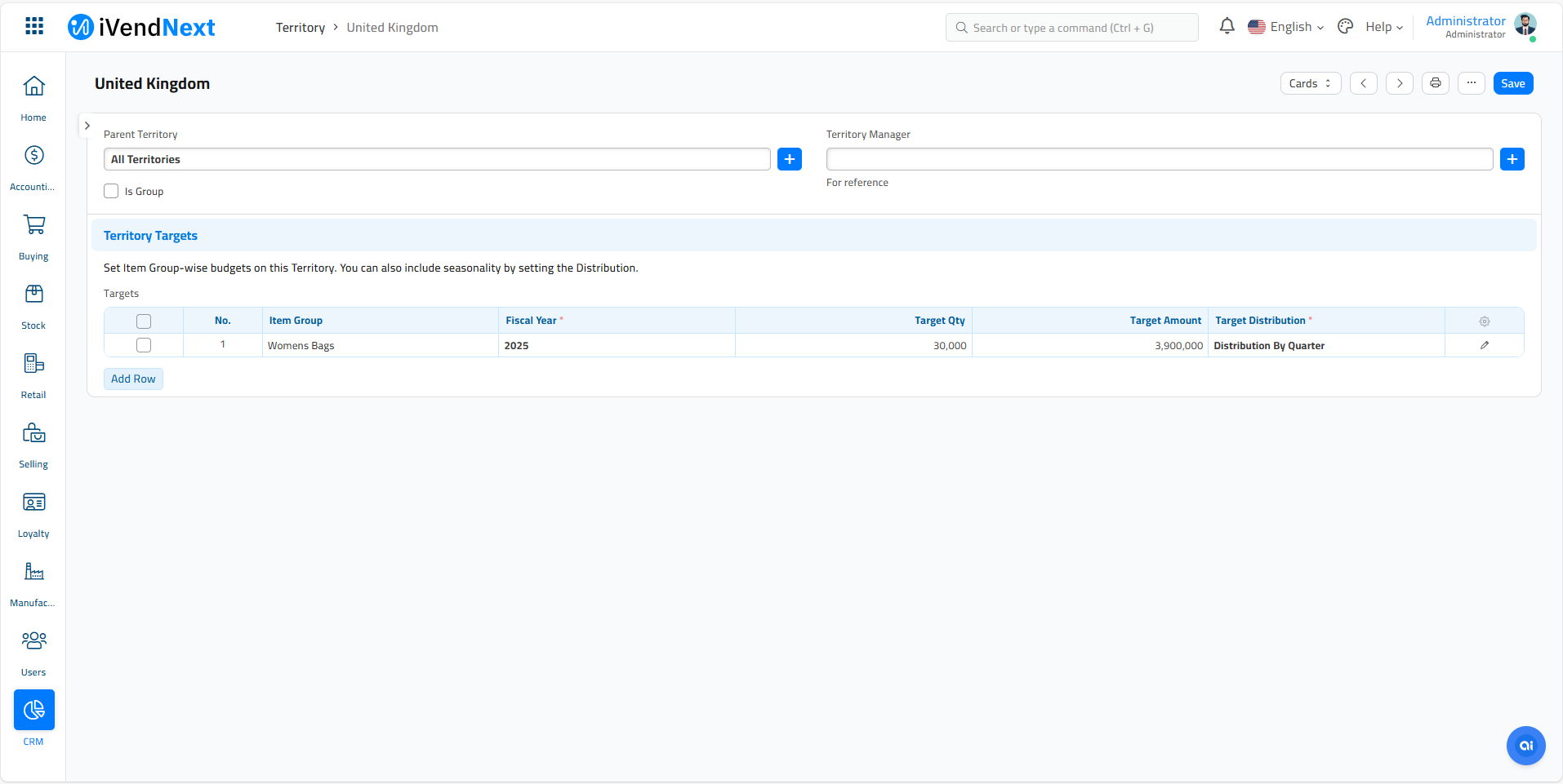 In iVendNext, a Territory is used to classify Customers, Addresses, in accounting reports, and to allocated sales targets.
