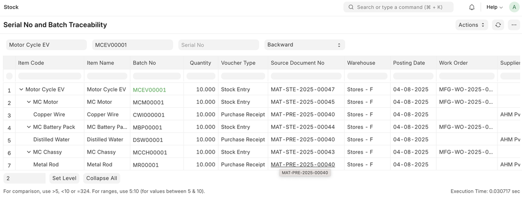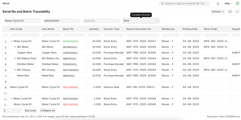 Serial No and Batch Traceability Report