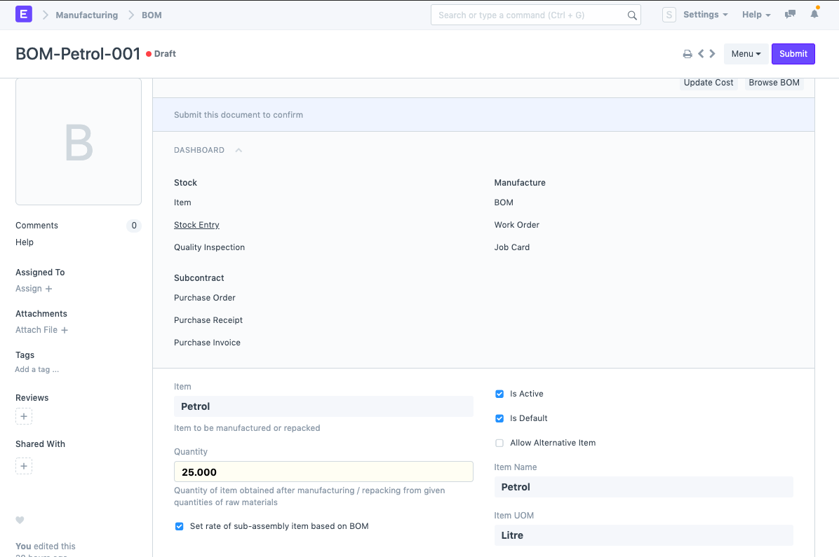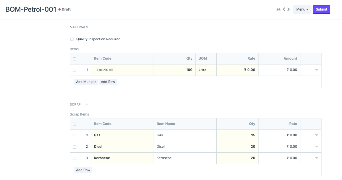 - After creation of item master create a BOM for any of the FG you are going to produce from Crude oil (RM). Here I have created BOM of Petrol for 25 litres where I am going to use Crude oil (RM) of qty. 100 litres. Rest of the FG like Gas, Diesel & Kerosene I have added in Scrap section.