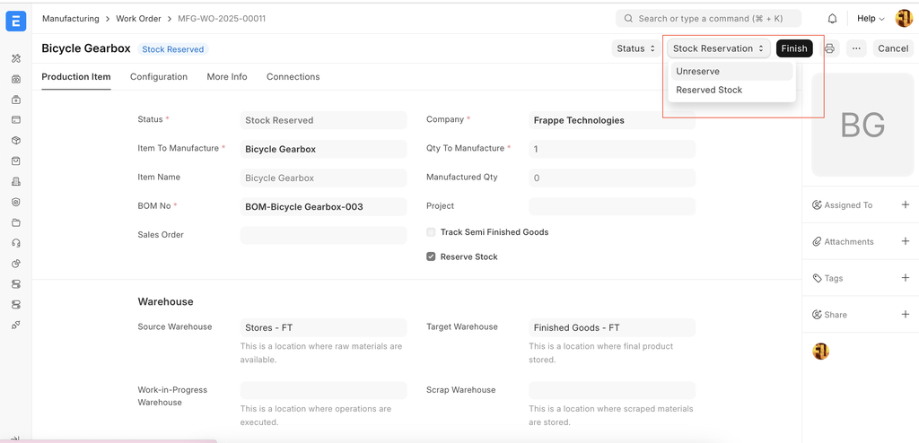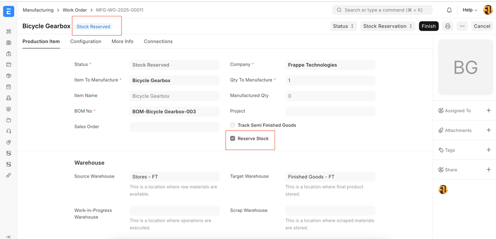 If the "Reserve Stock" checkbox is selected, the system will automatically create a stock reservation entry against the source warehouse for the available stock upon submission of the work order.