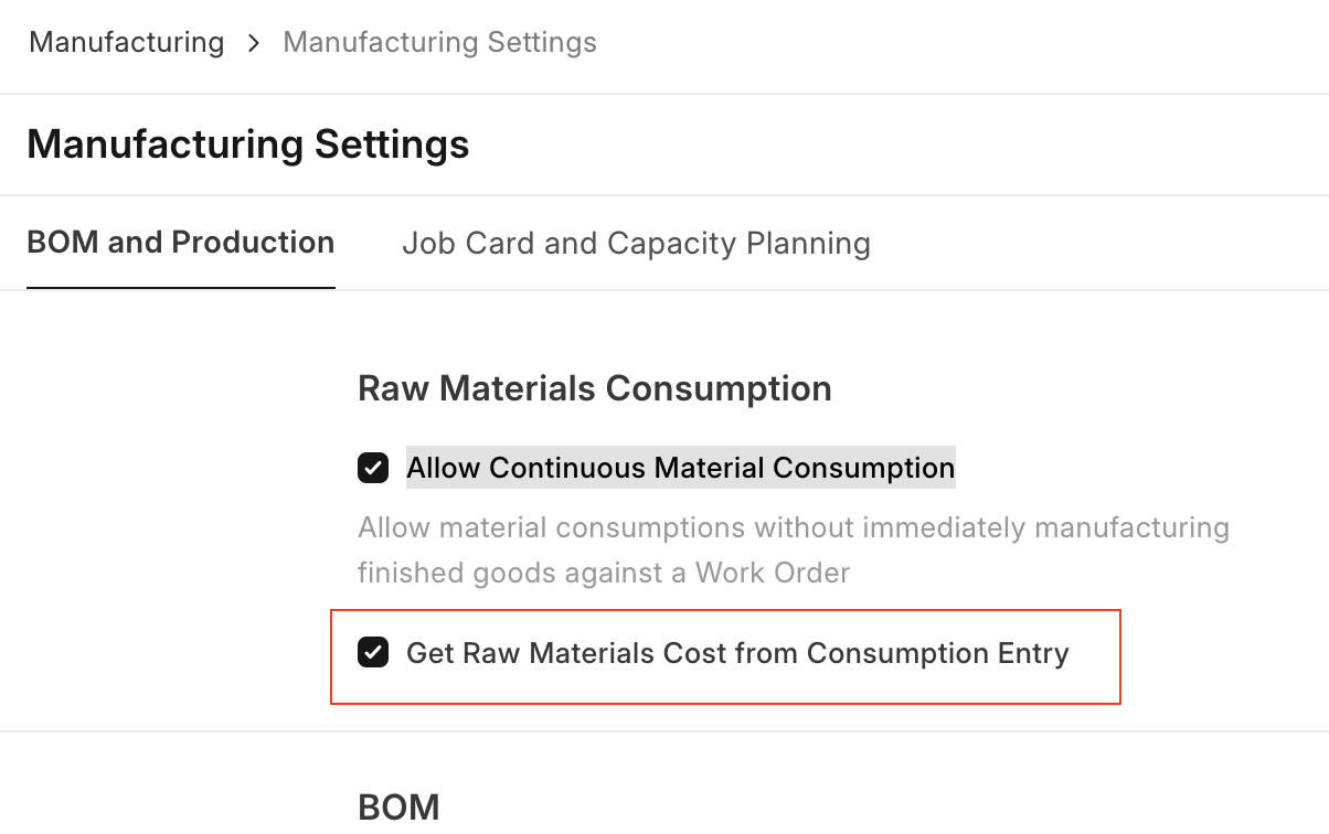 The 'Get Raw Materials Cost from Consumption Entry', determines whether the cost of raw materials used in production should be automatically derived from the consumption entries recorded during the manufacturing process. When enabled, iVendNext calculates the cost based on the actual materials consumed, ensuring accurate cost tracking and financial reporting.