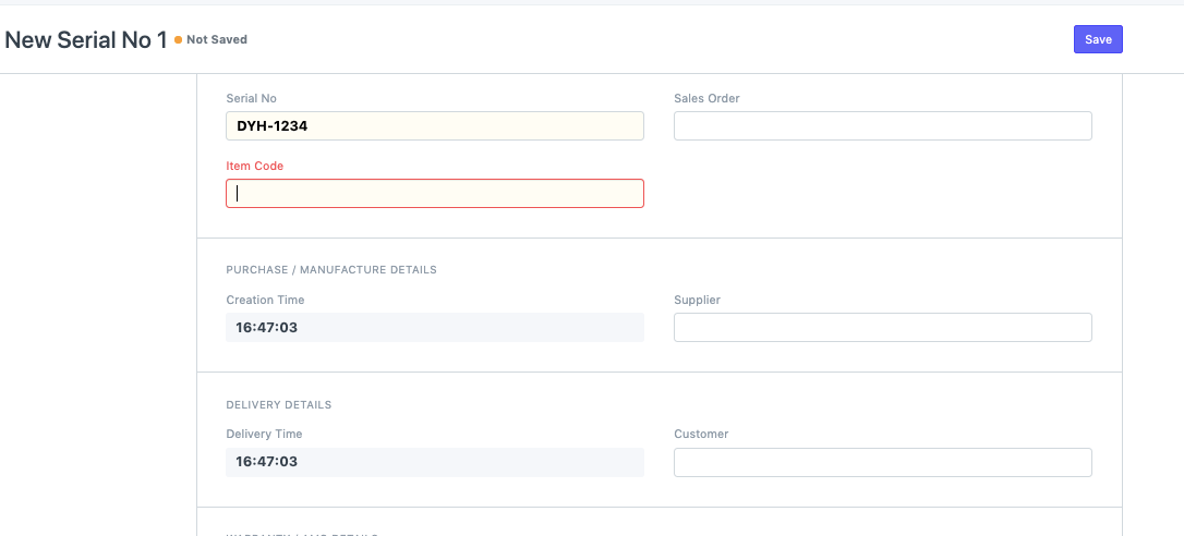 Navigate to Stock > Serial No and Batch > Serial No. Click on "New" to manually enter serial number details1. Enter the serial number and the item code, and save the entry.