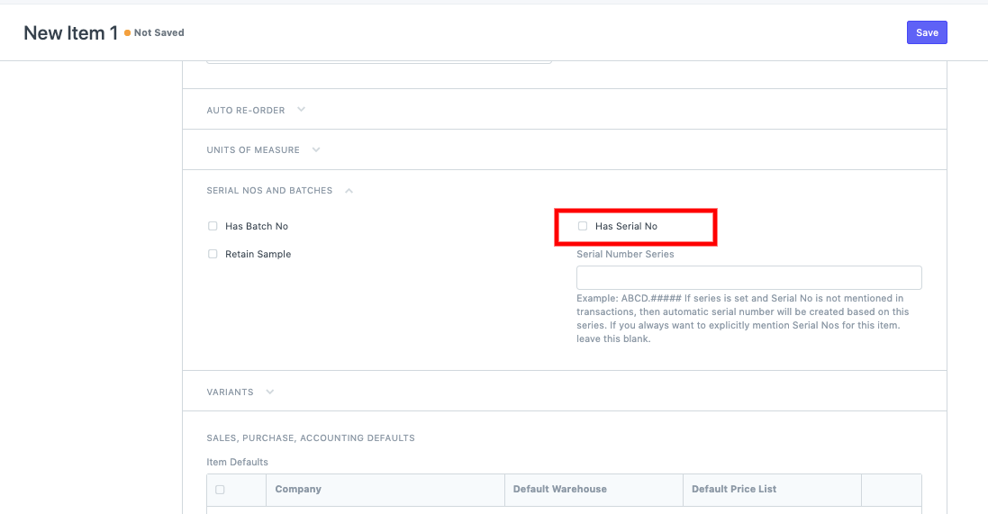 Go to Item List View screen > Add new item > Check Has Serial Number