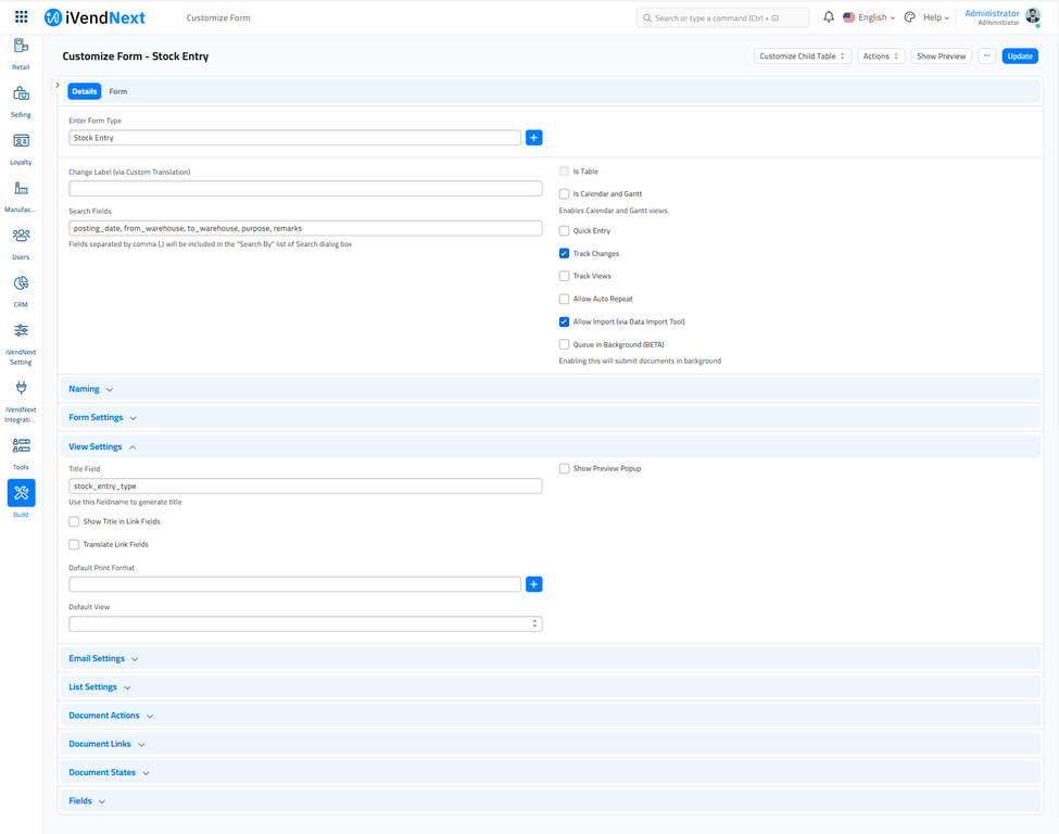 Open Customize Form using an awesome search bar or via Menu options of any DocType. This will open a screen where you can view all the fields that comprise this DocType.
